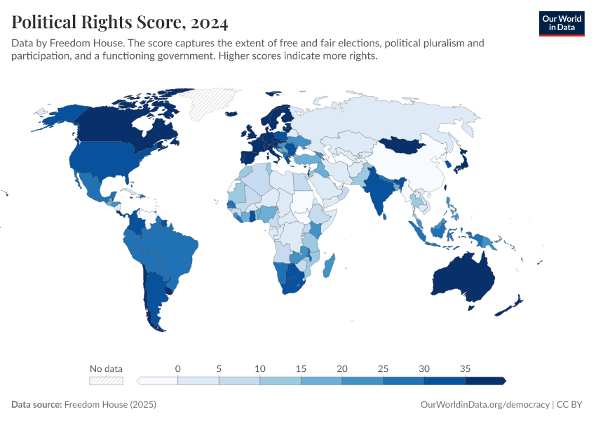 Freedom House (2025) – processed by Our World in Data. “Political Rights Score” [dataset]. Freedom House, “Freedom in the World” [original data]. Retrieved February 23, 2026 from https://chart-preview-staging.owid.pages.dev:8789/20260204-170225/grapher/political-rights-score-fh.html (archived on February 4, 2026).