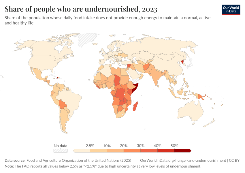 Food and Agriculture Organization of the United Nations (2025) – with major processing by Our World in Data. “Share of people who are undernourished – UN FAO” [dataset]. Food and Agriculture Organization of the United Nations, “SDG Indicators” [original data]. Retrieved February 23, 2026 from https://chart-preview-staging.owid.pages.dev:8789/20250909-093708/grapher/prevalence-of-undernourishment.html (archived on September 9, 2025).