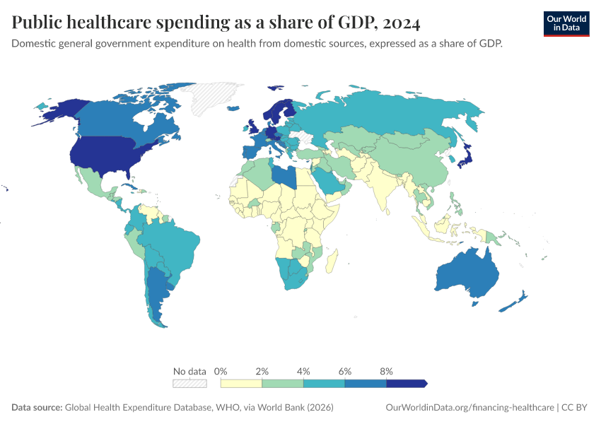 “Data Page: Public healthcare spending as a share of GDP”. Our World in Data (2026). Data adapted from Global Health Expenditure Database, WHO, via World Bank. Retrieved from https://chart-preview-staging.owid.pages.dev:8789/20260202-181317/grapher/public-healthcare-spending-share-gdp.html [online resource] (archived on February 2, 2026).How to cite this data
