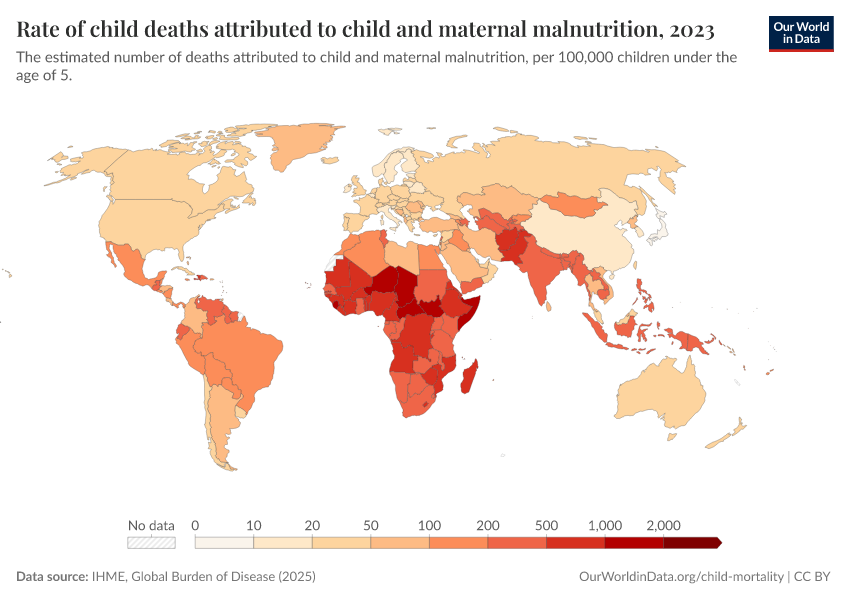 IHME, Global Burden of Disease (2025) – with major processing by Our World in Data. “Rate of child deaths attributed to child and maternal malnutrition” [dataset]. IHME, Global Burden of Disease, “Global Burden of Disease - Risk Factors - Deaths” [original data]. Retrieved February 23, 2026 from https://chart-preview-staging.owid.pages.dev:8789/20260213-112438/grapher/rate-of-child-deaths-attributed-to-child-and-maternal-malnutrition.html (archived on February 13, 2026).