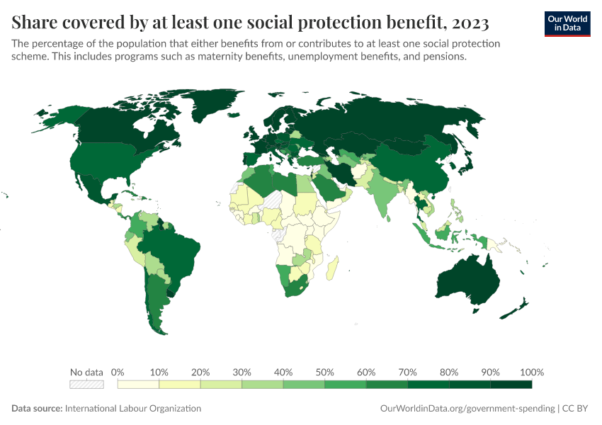 “Data Page: Share covered by at least one social protection benefit”. Our World in Data (2026). Data adapted from International Labour Organization. Retrieved from https://chart-preview-staging.owid.pages.dev:8789/20260130-180113/grapher/share-covered-by-one-social-protection-benefit.html [online resource] (archived on January 30, 2026).How to cite this data