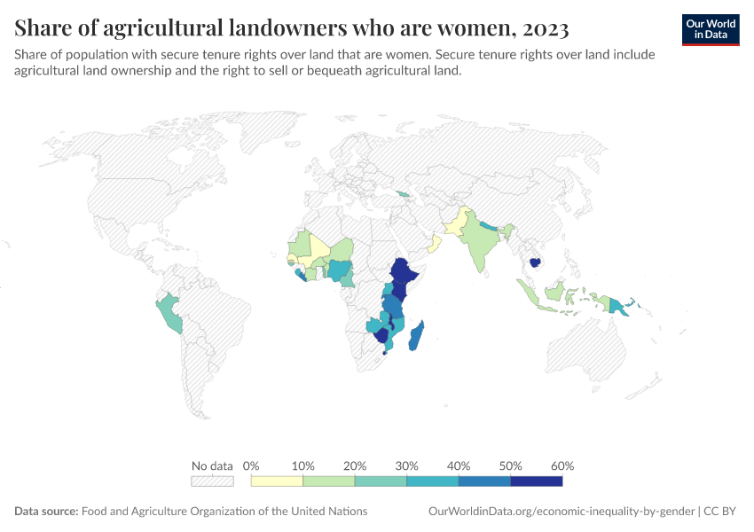 “Data Page: Share of agricultural landowners who are women”. Our World in Data (2026). Data adapted from Food and Agriculture Organization of the United Nations. Retrieved from https://chart-preview-staging.owid.pages.dev:8789/20260105-133053/grapher/share-of-agricultural-land-owners-that-are-women.html [online resource] (archived on January 5, 2026).How to cite this data