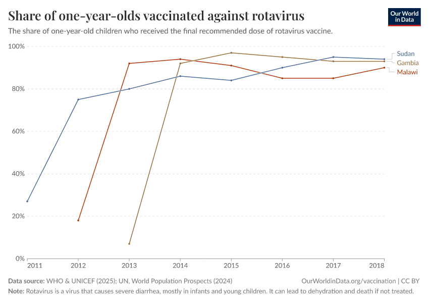 “Data Page: Share of one-year-olds vaccinated against rotavirus”, part of the following publication: Fiona Spooner, Saloni Dattani, Samantha Vanderslott, and Max Roser (2022) - “Vaccination”. Data adapted from WHO & UNICEF, United Nations. Retrieved from https://chart-preview-staging.owid.pages.dev:8789/20260119-070102/grapher/share-of-one-year-olds-who-received-the-rotavirus-vaccine.html [online resource] (archived on January 19, 2026).How to cite this data