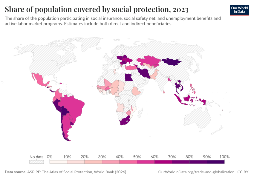 “Data Page: Share of population covered by social protection”. Our World in Data (2026). Data adapted from ASPIRE: The Atlas of Social Protection, World Bank. Retrieved from https://chart-preview-staging.owid.pages.dev:8789/20260202-181317/grapher/share-of-population-covered-by-social-protection.html [online resource] (archived on February 2, 2026).How to cite this data