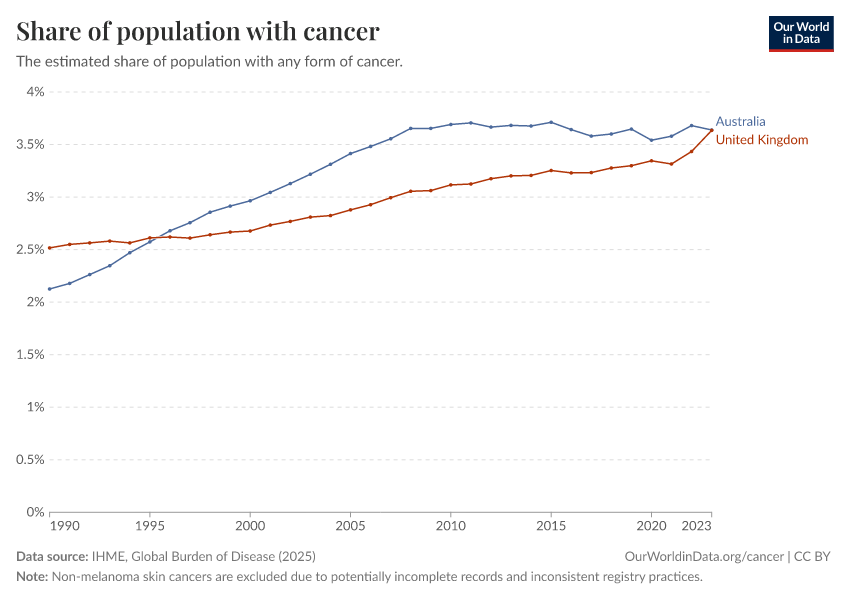 “Data Page: Share of population with cancer”, part of the following publication: Esteban Ortiz-Ospina and Max Roser (2016) - “Global Health”. Data adapted from IHME, Global Burden of Disease. Retrieved from https://chart-preview-staging.owid.pages.dev:8789/20260212-172859/grapher/share-of-population-with-cancer-crude.html [online resource] (archived on February 12, 2026).How to cite this data