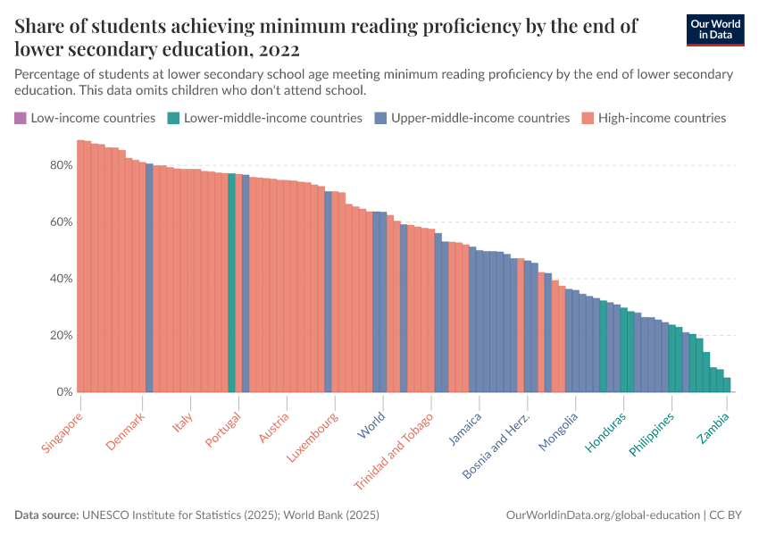 “Data Page: Share of students achieving minimum reading proficiency by the end of lower secondary education”, part of the following publication: Hannah Ritchie, Veronika Samborska, Esteban Ortiz-Ospina, and Max Roser (2023) - “Global Education”. Data adapted from UNESCO Institute for Statistics. Retrieved from https://chart-preview-staging.owid.pages.dev:8789/20260122-091445/grapher/share-of-students-at-end-of-lower-secondary-education-with-minimum-reading-proficiency.html [online resource] (archived on January 22, 2026).How to cite this data