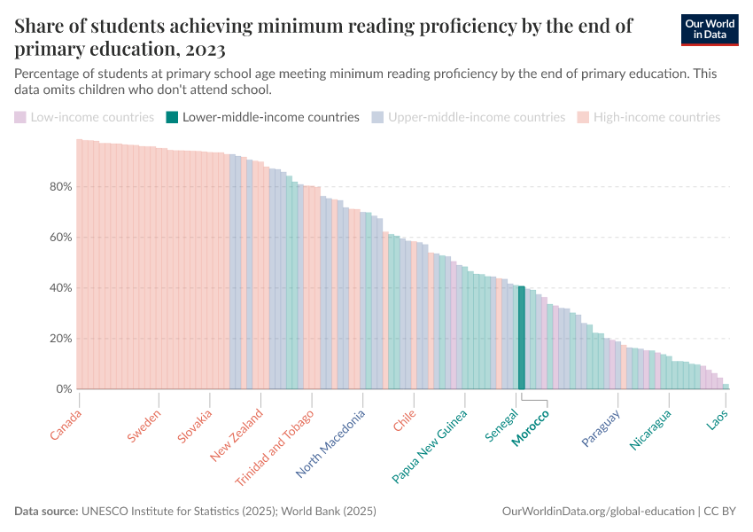 UNESCO Institute for Statistics (2025) – with minor processing by Our World in Data. “Share of students achieving minimum reading proficiency by the end of primary education” [dataset]. UNESCO Institute for Statistics, “UNESCO Institute for Statistics (UIS) - Education” [original data]. Retrieved February 23, 2026 from https://chart-preview-staging.owid.pages.dev:8789/20260122-091445/grapher/share-of-students-at-end-of-primary-education-achieving-minimum-reading-proficiency.html (archived on January 22, 2026).