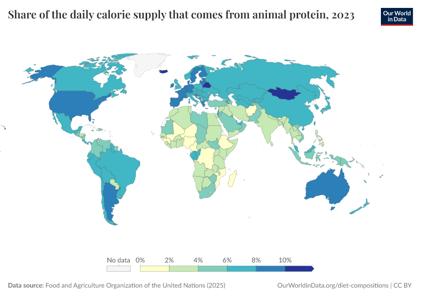 “Data Page: Share of the daily calorie supply that comes from animal protein”, part of the following publication: Hannah Ritchie, Pablo Rosado, and Max Roser (2023) - “Agricultural Production”. Data adapted from Food and Agriculture Organization of the United Nations. Retrieved from https://chart-preview-staging.owid.pages.dev:8789/20260116-144923/grapher/share-of-the-daily-calorie-supply-that-comes-from-animal-protein.html [online resource] (archived on January 16, 2026).How to cite this data