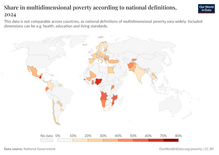 “Data Page: Share in multidimensional poverty according to national definitions”. Our World in Data (2026). Data adapted from National Government. Retrieved from https://chart-preview-staging.owid.pages.dev:8789/20260105-133053/grapher/share-people-multidimensional-poverty-national-definitions.html [online resource] (archived on January 5, 2026).How to cite this data