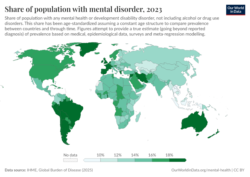 IHME, Global Burden of Disease (2025) – with major processing by Our World in Data. “Share of population with mental disorder” [dataset]. IHME, Global Burden of Disease, “Global Burden of Disease - Mental Health Prevalence” [original data]. Retrieved February 23, 2026 from https://chart-preview-staging.owid.pages.dev:8789/20260212-100858/grapher/share-with-mental-health-or-development-disorder.html (archived on February 12, 2026).