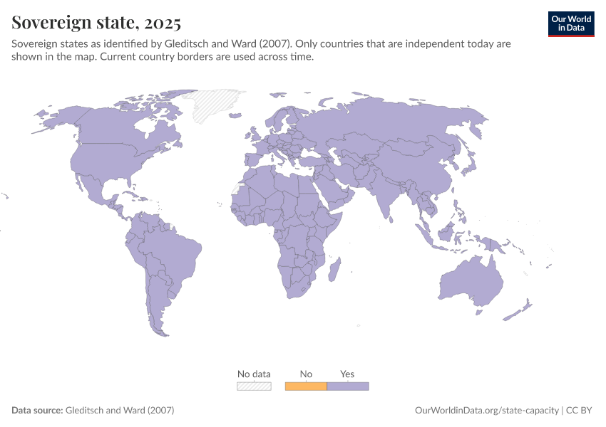 “Data Page: Sovereign state”, part of the following publication: Bastian Herre and Pablo Arriagada (2023) - “State Capacity”. Data adapted from Gleditsch and Ward. Retrieved from https://chart-preview-staging.owid.pages.dev:8789/20260119-070102/grapher/sovereign-state-gleditsch-ward.html [online resource] (archived on January 19, 2026).How to cite this data