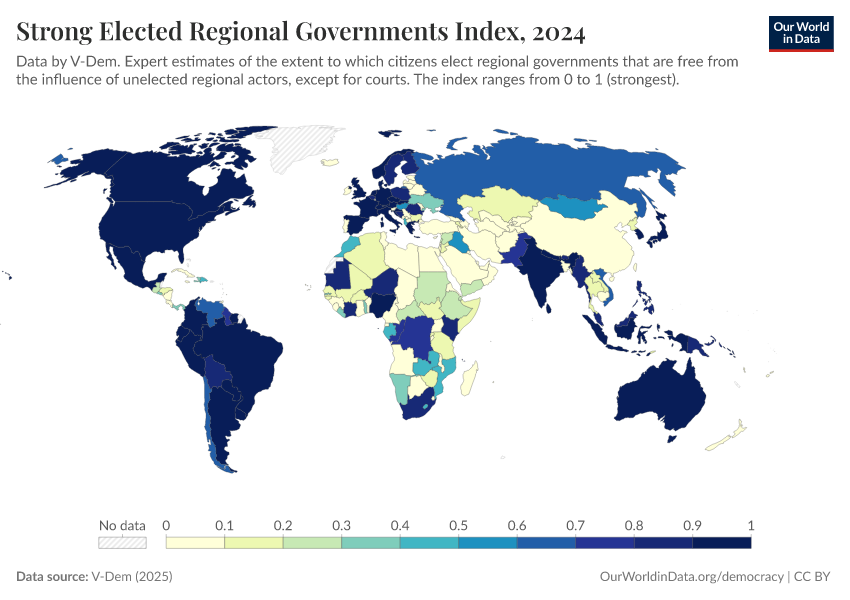 “Data Page: Elected regional governments”, part of the following publication: Bastian Herre, Lucas Rodés-Guirao, and Esteban Ortiz-Ospina (2013) - “Democracy”. Data adapted from V-Dem. Retrieved from https://chart-preview-staging.owid.pages.dev:8789/20260119-070102/grapher/strong-elected-regional-governments-index.html [online resource] (archived on January 19, 2026).How to cite this data