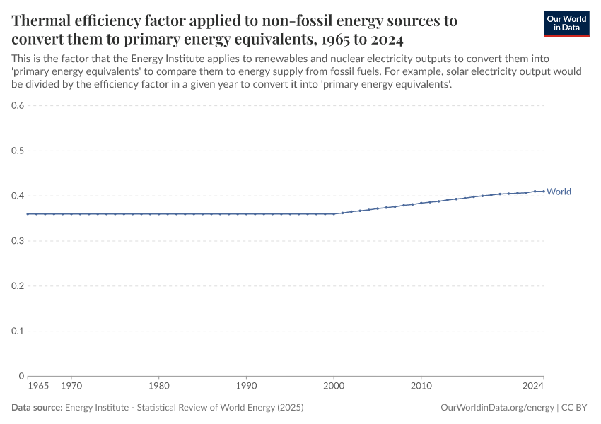 Energy Institute - Statistical Review of World Energy (2025) – with major processing by Our World in Data. “Thermal equivalent efficiency factors” [dataset]. Energy Institute, “Statistical Review of World Energy” [original data]. Retrieved February 23, 2026 from https://chart-preview-staging.owid.pages.dev:8789/20260119-065148/grapher/thermal-efficiency-factor.html (archived on January 19, 2026).