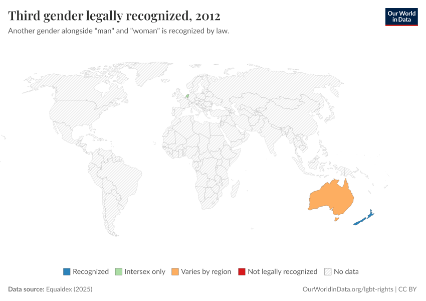 “Data Page: Third gender legally recognized”, part of the following publication: Bastian Herre and Pablo Arriagada (2023) - “LGBT+ Rights”. Data adapted from Equaldex. Retrieved from https://chart-preview-staging.owid.pages.dev:8789/20250909-093708/grapher/third-gender-recognition-equaldex.html [online resource] (archived on September 9, 2025).How to cite this data