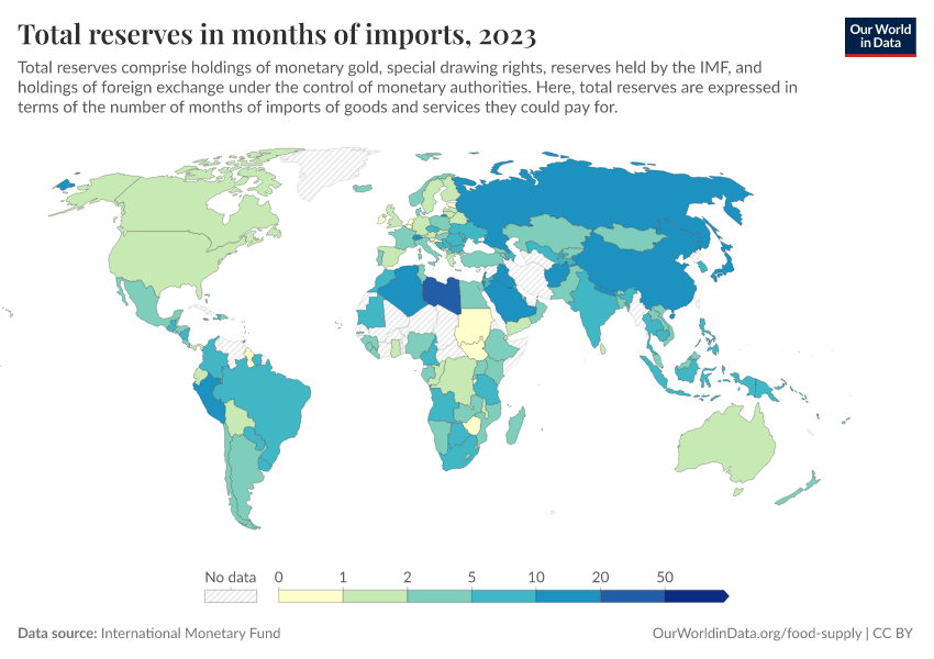 “Data Page: Total reserves in months of imports”. Our World in Data (2026). Data adapted from International Monetary Fund. Retrieved from https://chart-preview-staging.owid.pages.dev:8789/20260130-180113/grapher/total-reserves-in-months-of-imports.html [online resource] (archived on January 30, 2026).How to cite this data