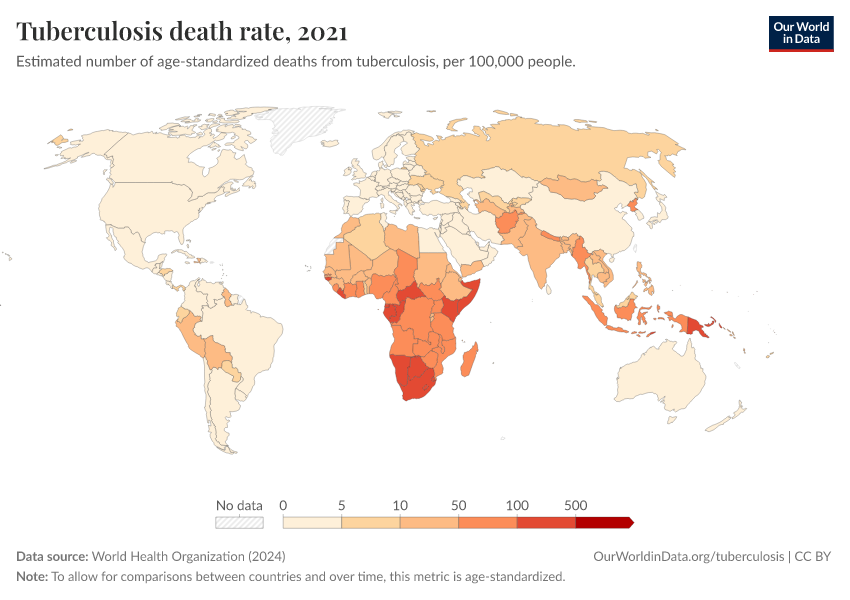 World Health Organization (2024) – with major processing by Our World in Data. “Tuberculosis death rate” [dataset]. World Health Organization, “Global Health Estimates” [original data]. Retrieved February 23, 2026 from https://chart-preview-staging.owid.pages.dev:8789/20250909-093708/grapher/tuberculosis-death-rate-age-standardized.html (archived on September 9, 2025).