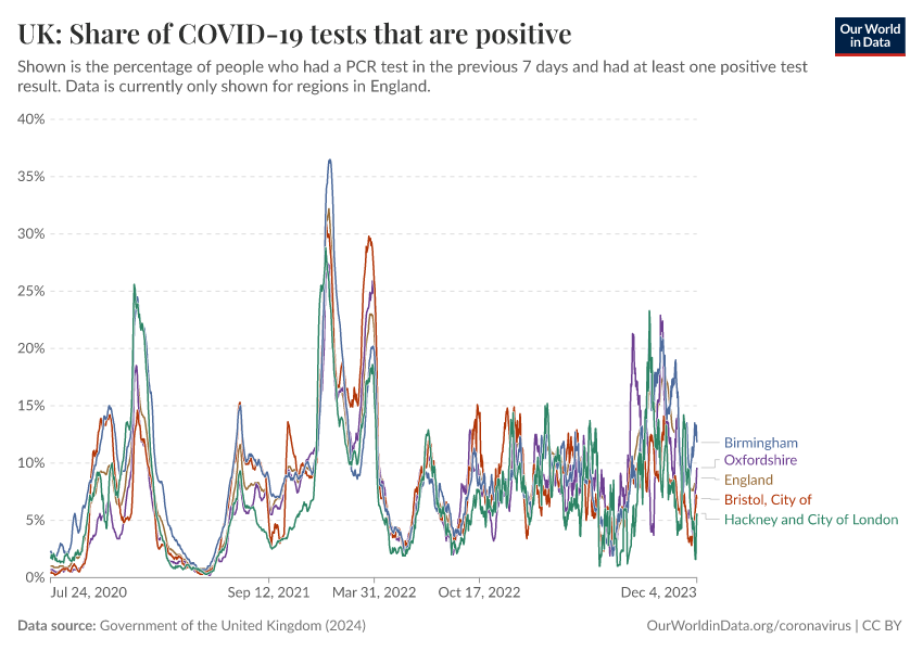 Government of the United Kingdom (2024) – with minor processing by Our World in Data. “UK: Share of COVID-19 tests that are positive” [dataset]. Government of the United Kingdom, “UKHSA data dashboard” [original data]. Retrieved February 23, 2026 from https://chart-preview-staging.owid.pages.dev:8789/20250909-093708/grapher/uk-covid-positivity.html (archived on September 9, 2025).