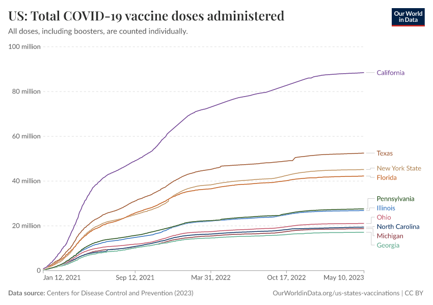 Centers for Disease Control and Prevention (2023) – processed by Our World in Data. “US: Total COVID-19 vaccine doses administered” [dataset]. Centers for Disease Control and Prevention, “COVID-19, Vaccinations (United States)” [original data]. Retrieved February 23, 2026 from https://chart-preview-staging.owid.pages.dev:8789/20250909-093708/grapher/us-total-covid-19-vaccine-doses-administered.html (archived on September 9, 2025).