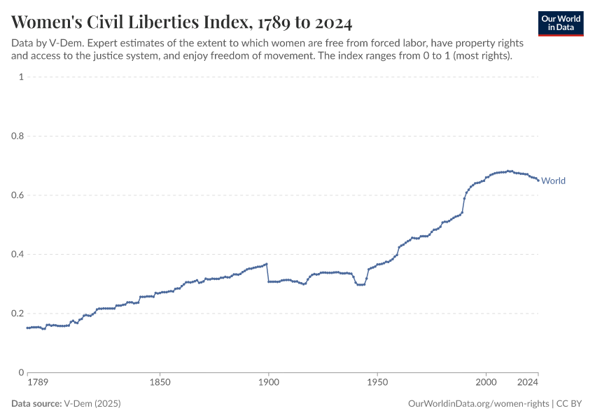 V-Dem (2025) – processed by Our World in Data. “Women's civil rights index – V-Dem” [dataset]. V-Dem, “Democracy report v15” [original data]. Retrieved February 23, 2026 from https://chart-preview-staging.owid.pages.dev:8789/20260119-070102/grapher/women-civil-liberties-index.html (archived on January 19, 2026).