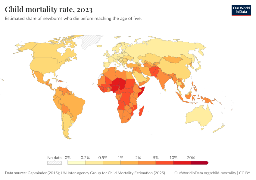 Child mortality measures the share of newborns who would not survive to their fifth birthday, given death rates at young ages in a population.