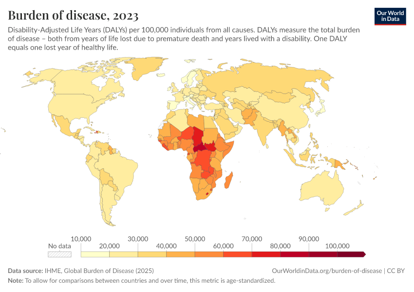 This map shows DALYs per 100,000 people in the population. It is thereby measuring the distribution of the burden of both mortality and morbidity around the world.