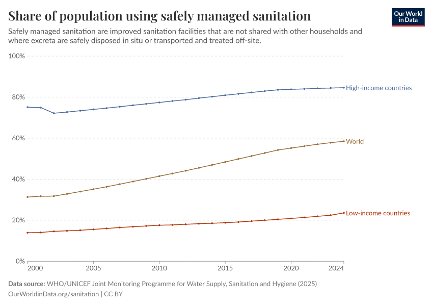 In the chart below, you can see share who use safely-managed sanitation, which has risen gradually over time.