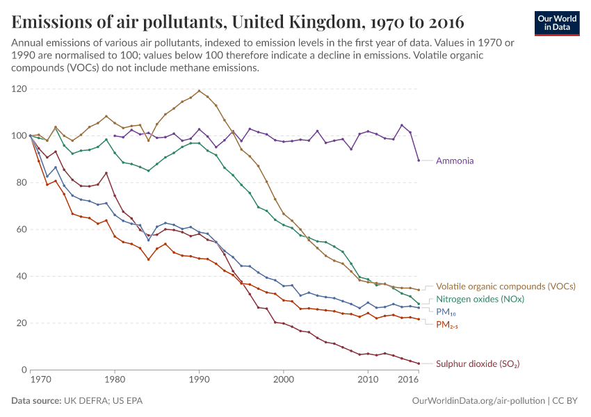 In the visualization, we see the relative change in air pollution emissions in the UK since 1970. Levels of emissions in 1970 (1980 for ammonia) are assigned a value of 100 – this means a value of 40 would mean emissions in the given year were 40% of what they were in 1970 (a 60% decline).