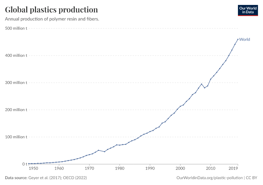 Plastic production has sharply increased over the last 70 years. In 1950, the world produced just two million tonnes. It now produces over 450 million tonnes.