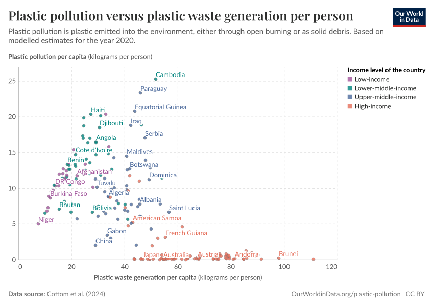 - This is reflected in data for income groups: low-income countries produce almost 100 times more plastic pollution per person than high-income countries.