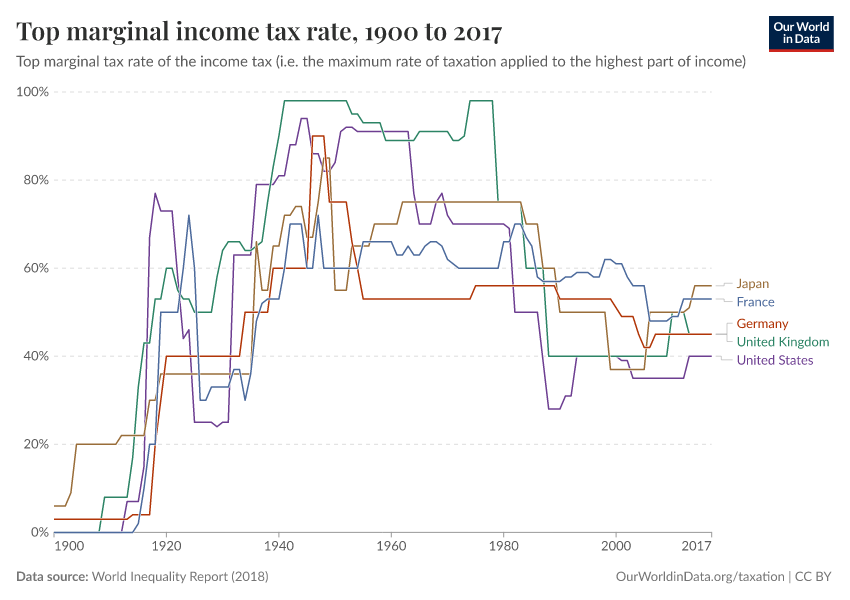 The chart here gives us an idea of how income taxation has changed in rich countries, by plotting trends in top marginal rates across France, Germany, the UK, the US, and Japan, over more than the last century.