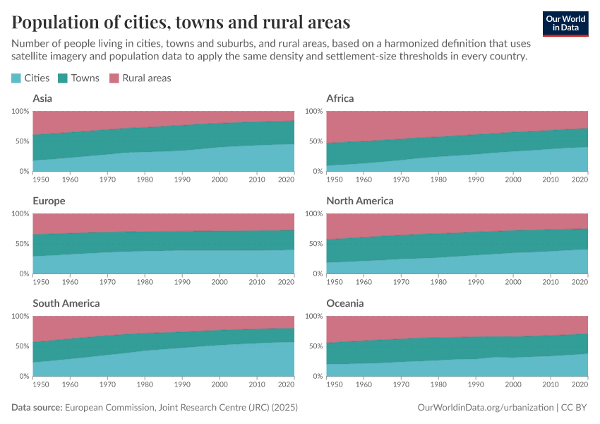 However, the manual on how to apply the Degree of Urbanization recommends reporting figures across three distinct categories—cities, towns, and villages—rather than using a simple urban-rural dichotomy. This approach recognizes urbanization as a continuum, acknowledging that towns occupy a unique position, differing significantly from both cities and villages in their characteristics and needs. The reported cities, and towns population shares by continent are shown in the chart below.
