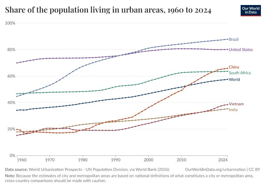 Hannah Ritchie, Veronika Samborska, and Max Roser (2024) - “Urbanization” Published online at OurWorldinData.org. Retrieved from: 'https://chart-preview-staging.owid.pages.dev/urbanization' [Online Resource]BibTeX citation