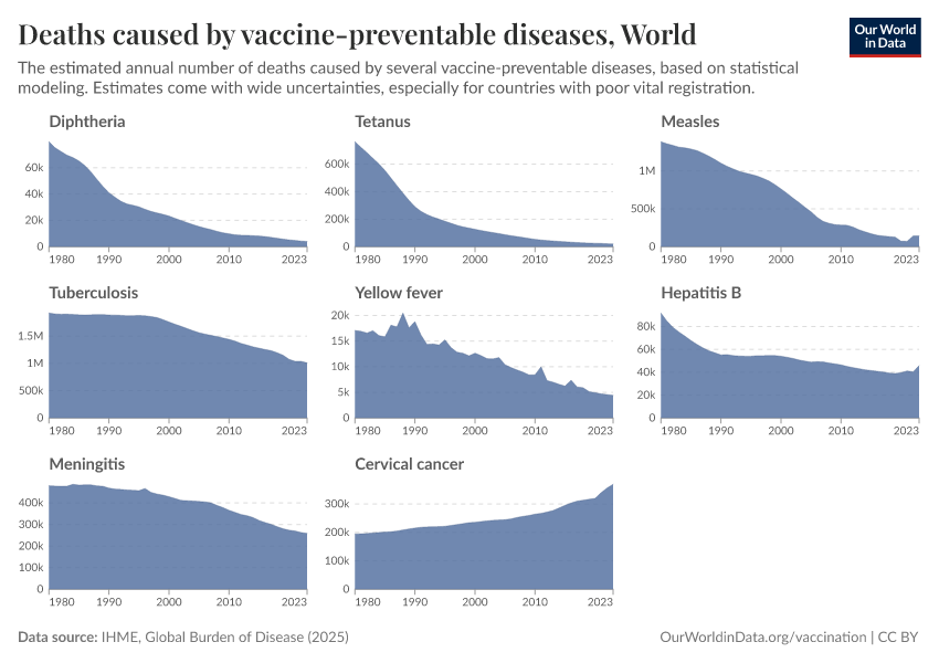 This chart shows the estimated number of deaths each year since 1980 from various diseases against which vaccines are available.