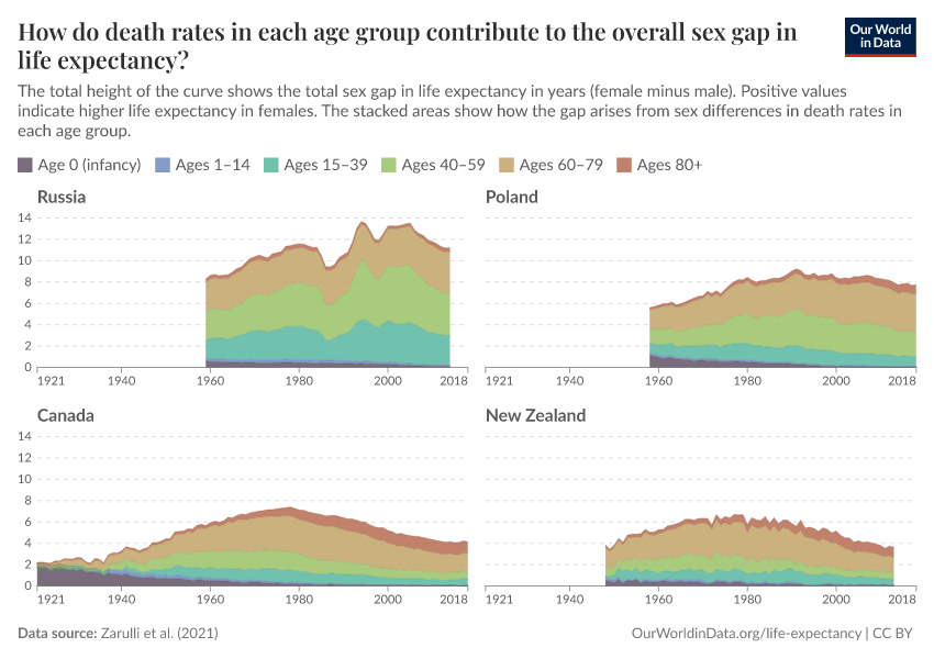 The chart below shows that there are also differences between countries. In Russia and Poland, for example, the overall sex gap in life expectancy is still large due to higher death rates in young and middle-aged men than women.