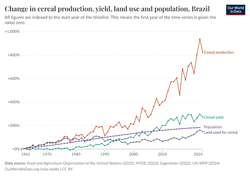 Brazil’s cereal production has increased dramatically since 1961, far exceeding its population increase.