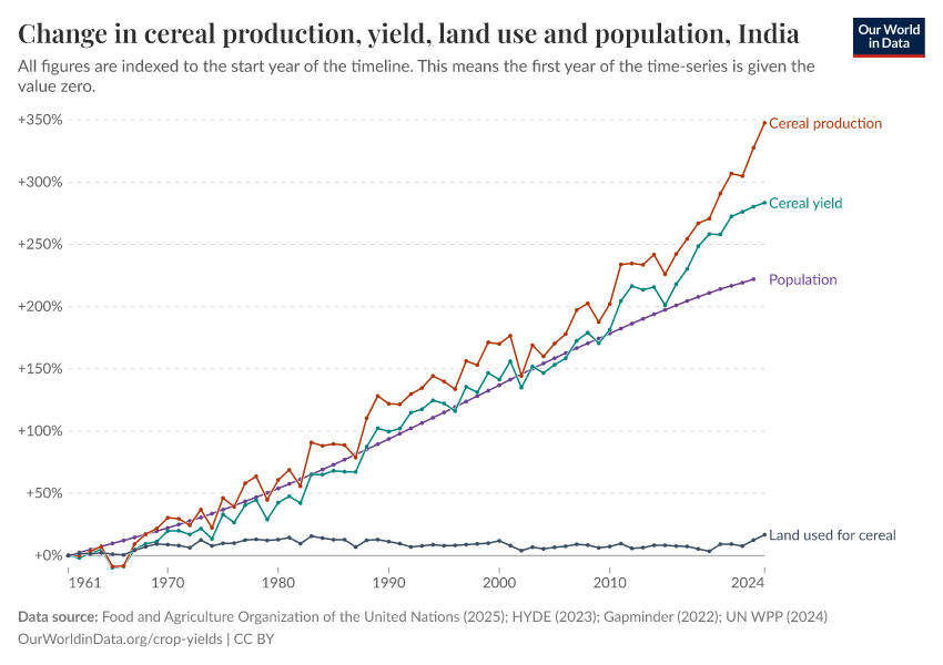 Hannah Ritchie (2017) - “Yields vs. land use: how the Green Revolution enabled us to feed a growing population” Published online at OurWorldinData.org. Retrieved from: 'https://chart-preview-staging.owid.pages.dev:8789/20260119-235736/yields-vs-land-use-how-has-the-world-produced-enough-food-for-a-growing-population.html' [Online Resource] (archived on January 19, 2026).BibTeX citation